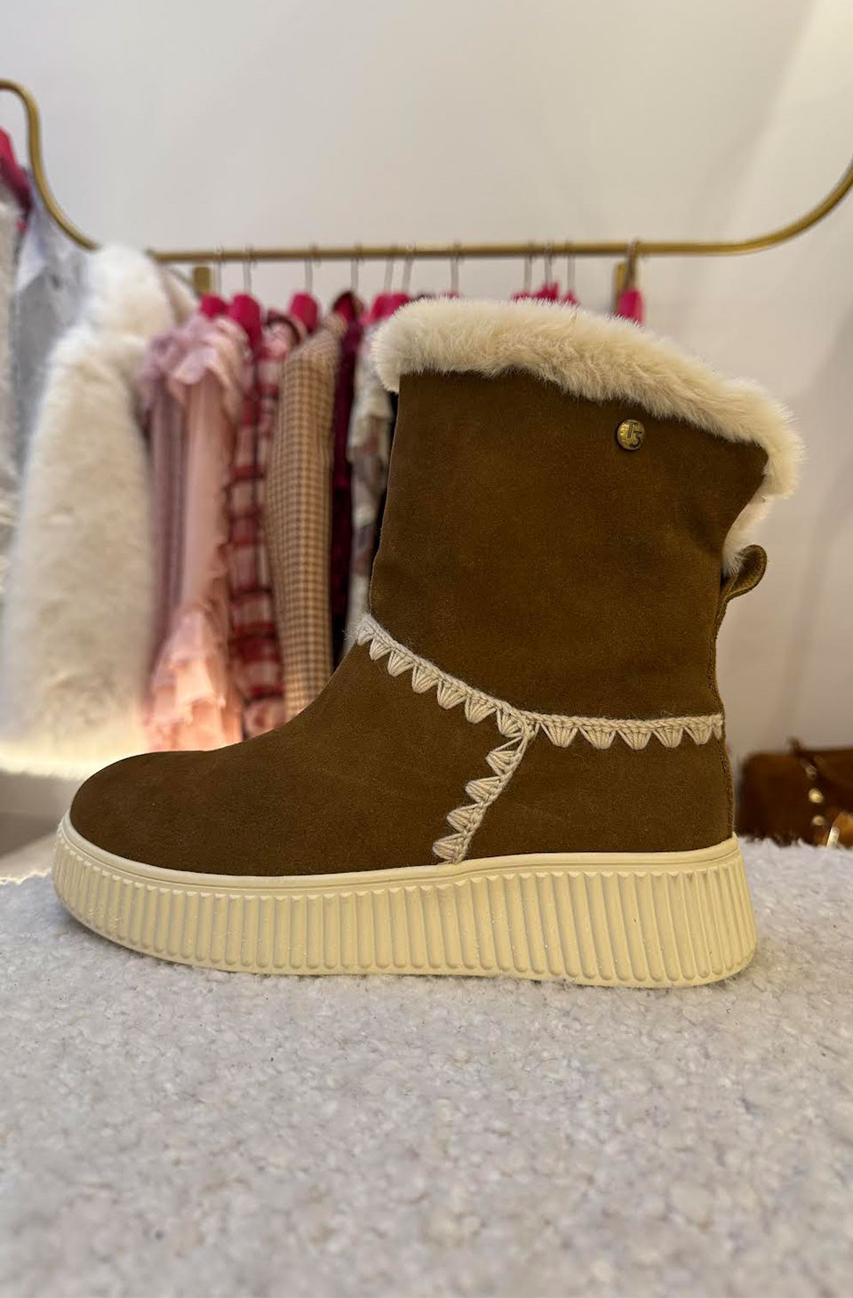 Brown suede ankle boots with faux fur lining and chunky white sole