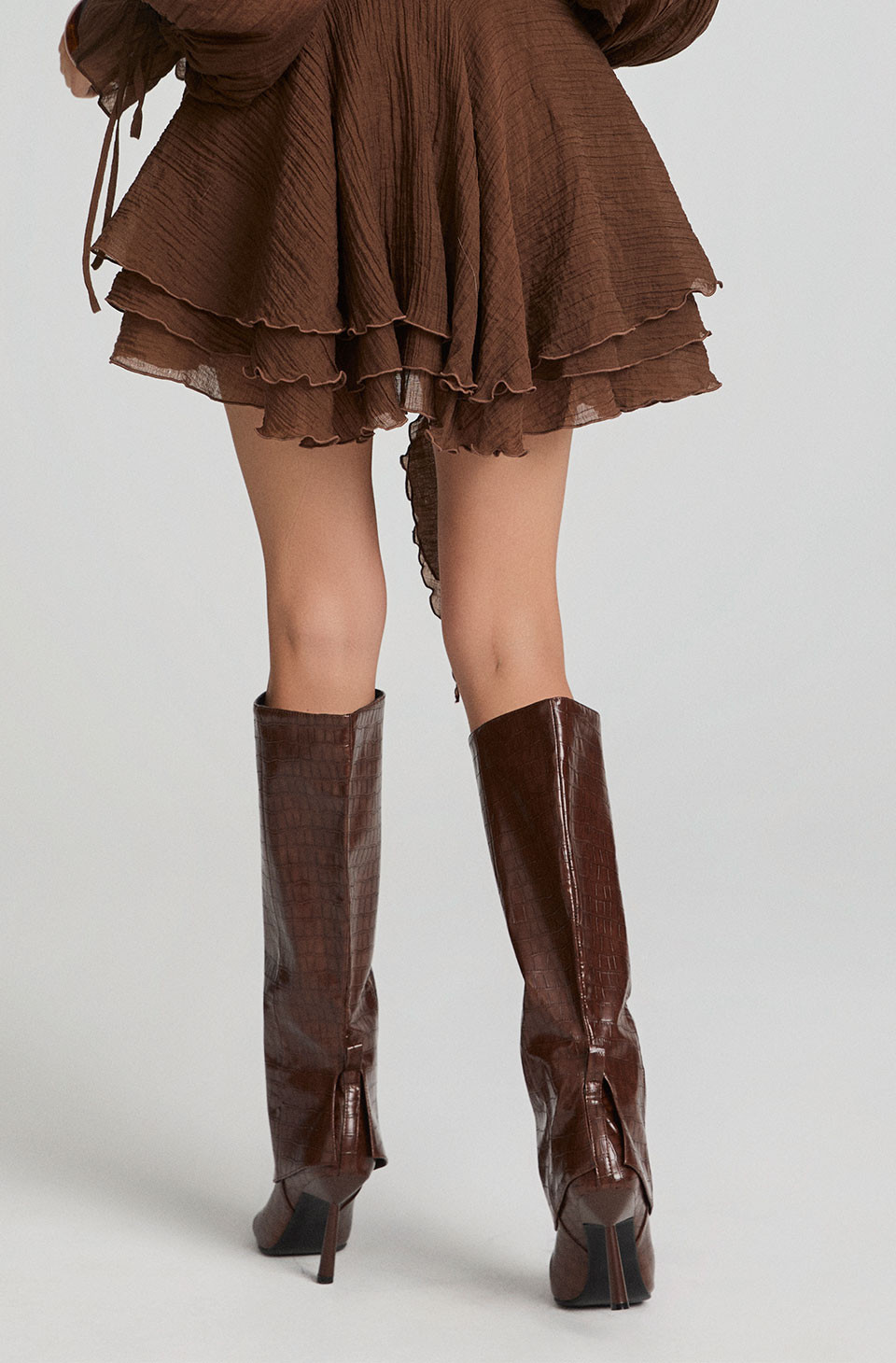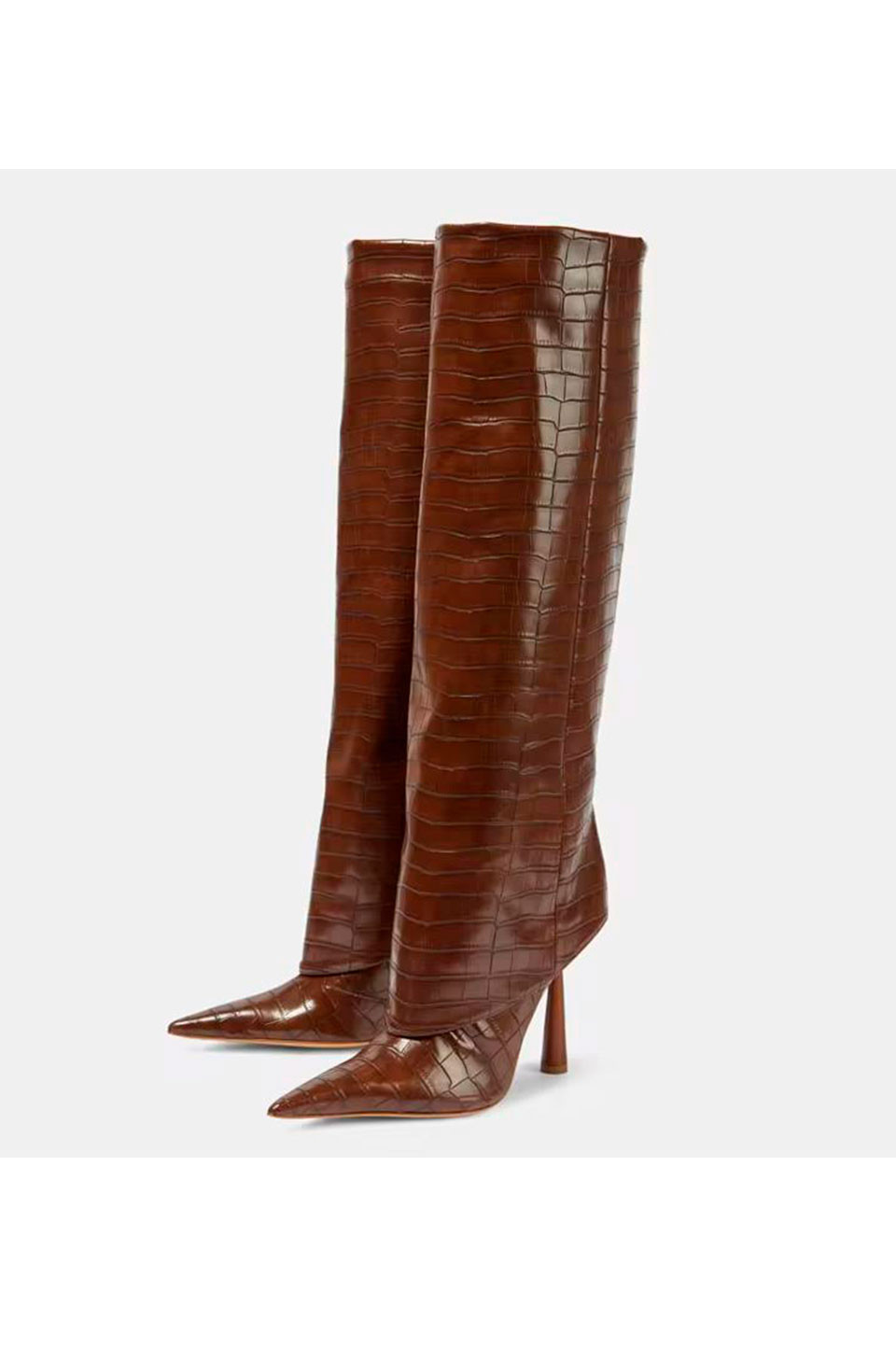 Brown high-heeled crocodile-effect boots – bold, elegant and timeless