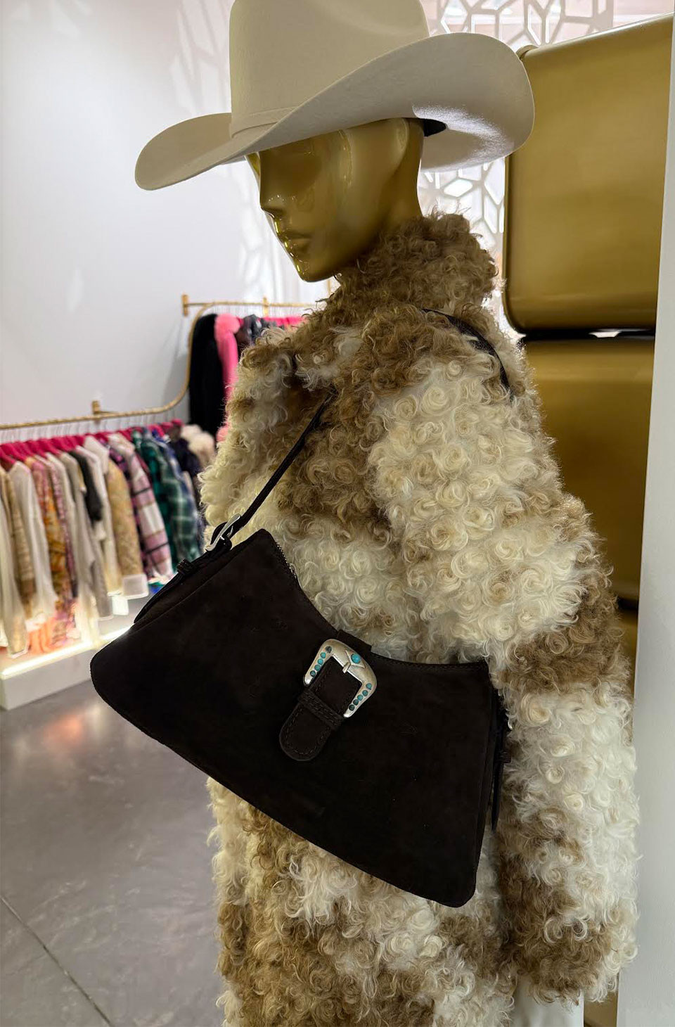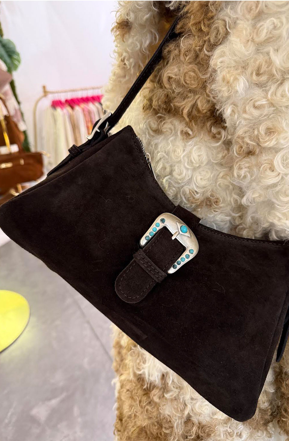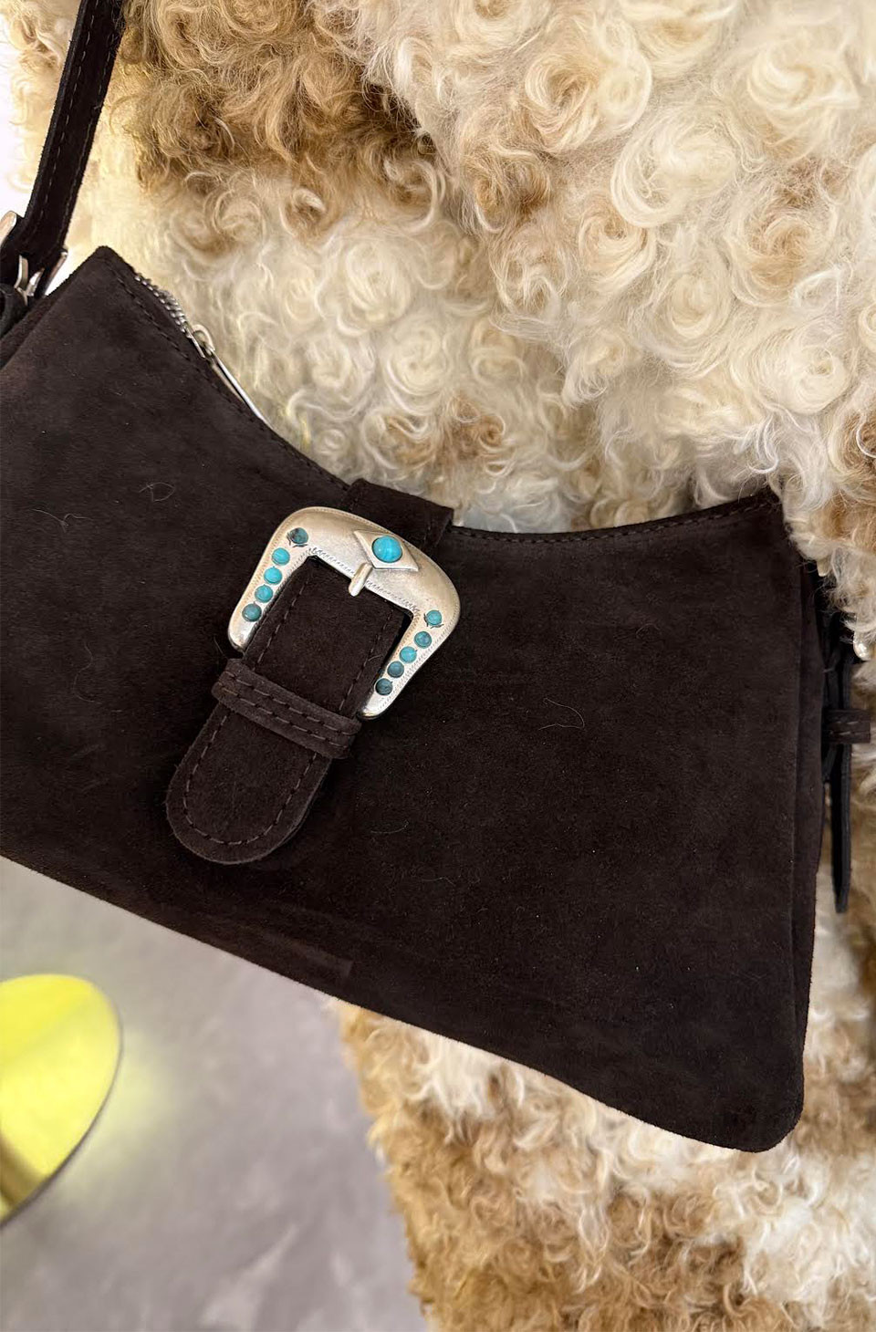• This brown suede shoulder bag is the kind of accessory that instantly pulls an outfit together. Its streamlined, lightweight silhouette feels soft to the touch, offering the natural elegance and durability of premium suede. The standout detail is the western-inspired buckle, finished with subtle turquoise-style accents that add a refined boho attitude without overwhelming the design.