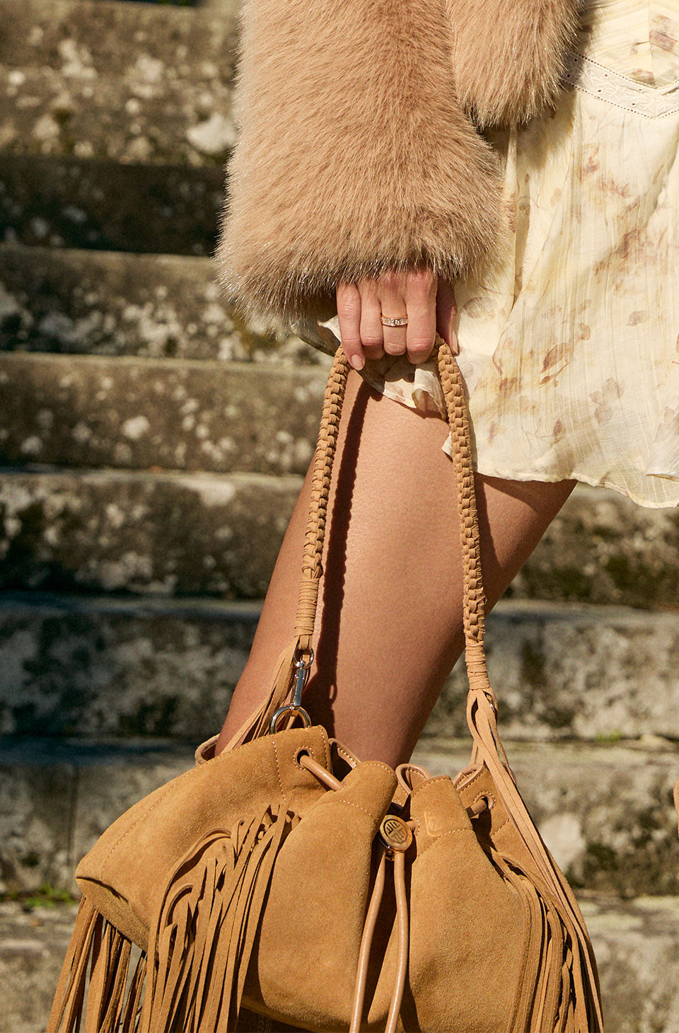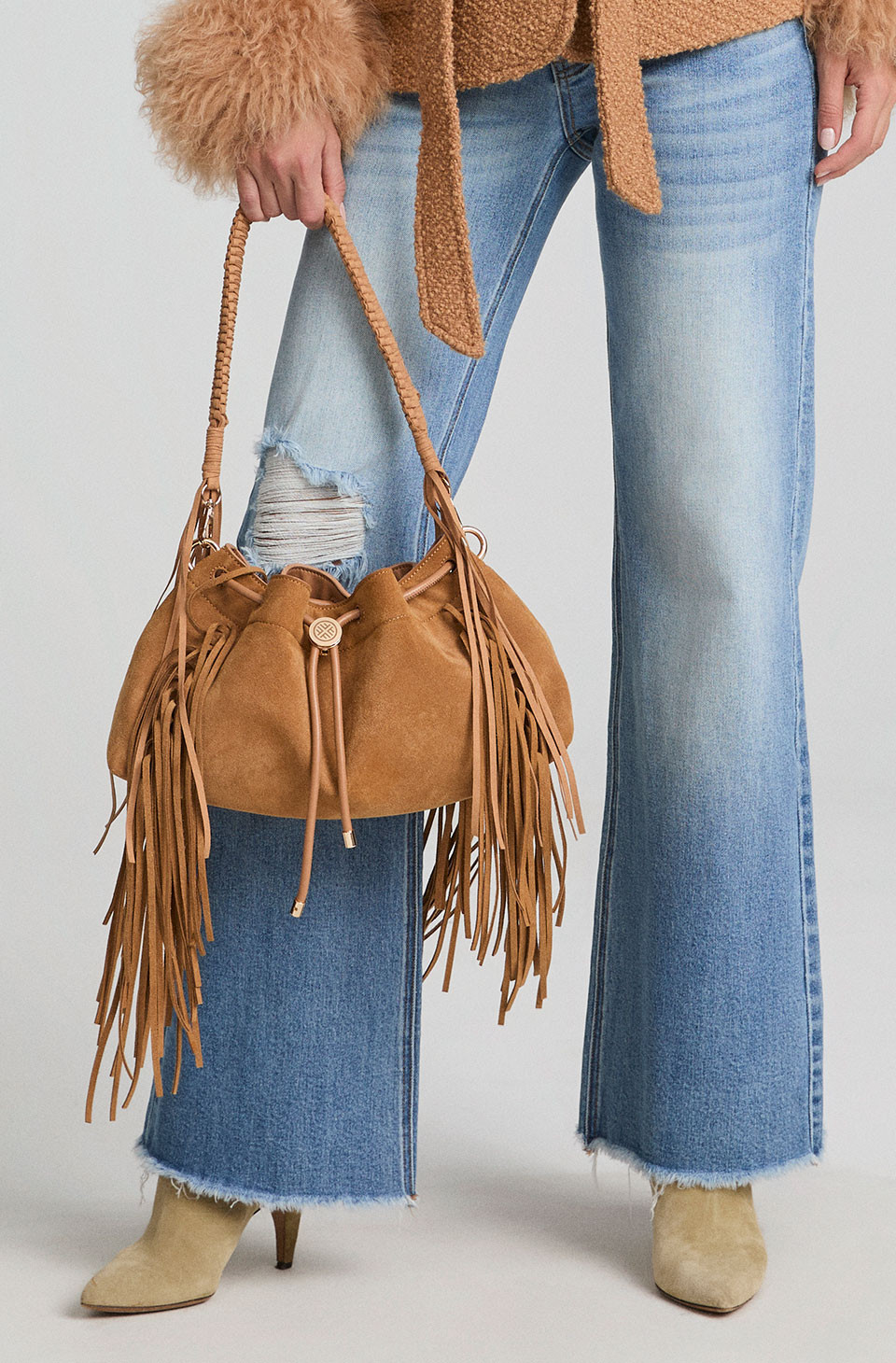 This suede fringe bag is the definition of effortless style and craftsmanship. Made from premium soft suede, it features a relaxed bucket shape, flowing fringes, and a beautifully braided handle that adds a handcrafted touch. The warm camel tone makes it a versatile accessory that pairs perfectly with jeans, cozy knits, or tailored coats.