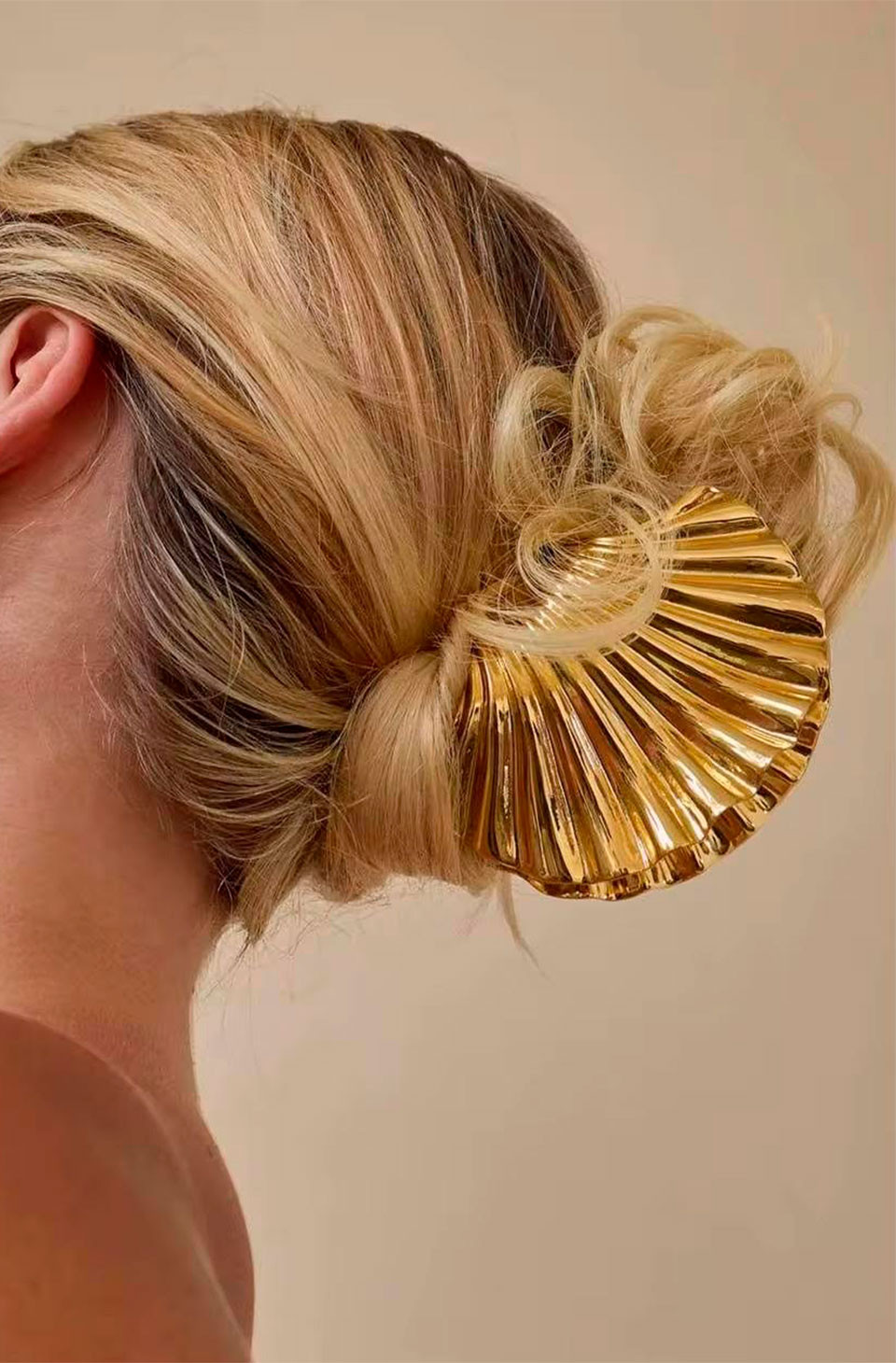 Fabricado en un acabado dorado brillante, mantiene un equilibrio perfecto entre modernidad y estilo clásico. Su estructura sólida sujeta el cabello con firmeza sin dañarlo, permitiendo crear moños bajos, recogidos deshechos o semirecogidos con un acabado pulido y femenino.