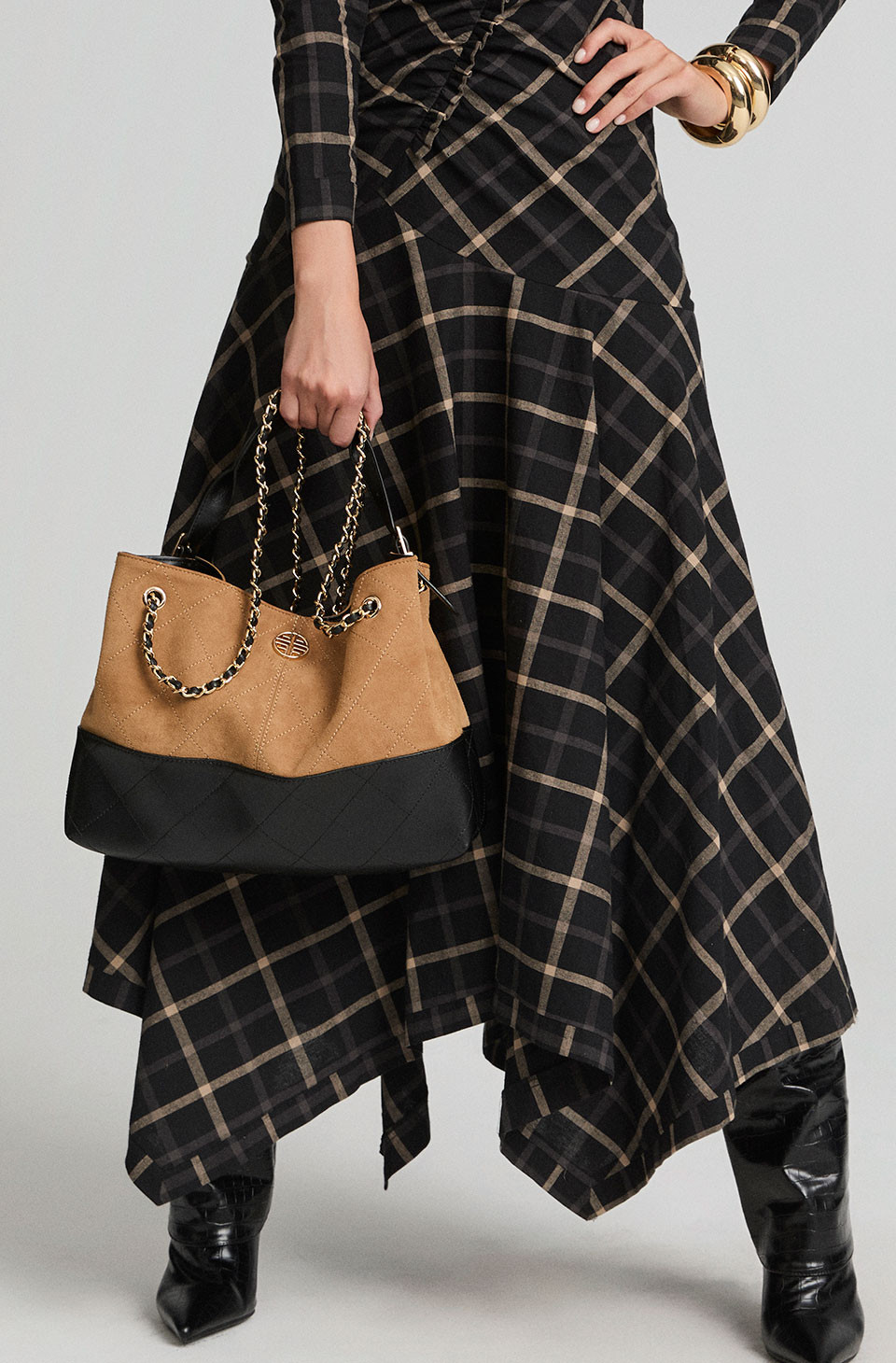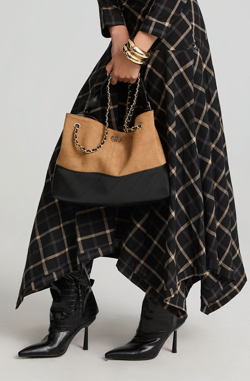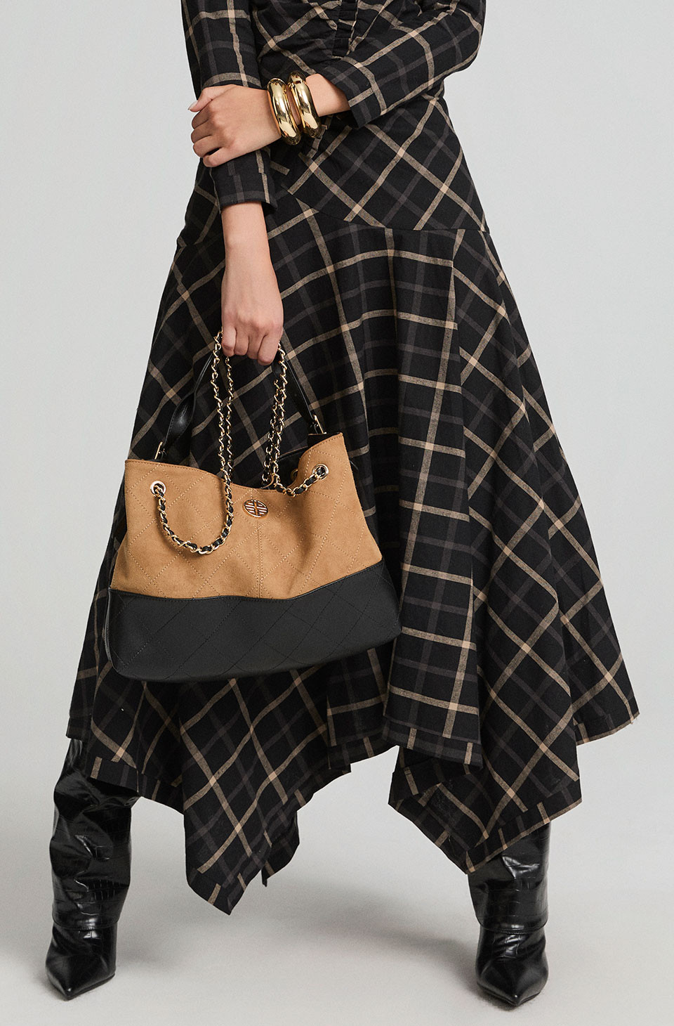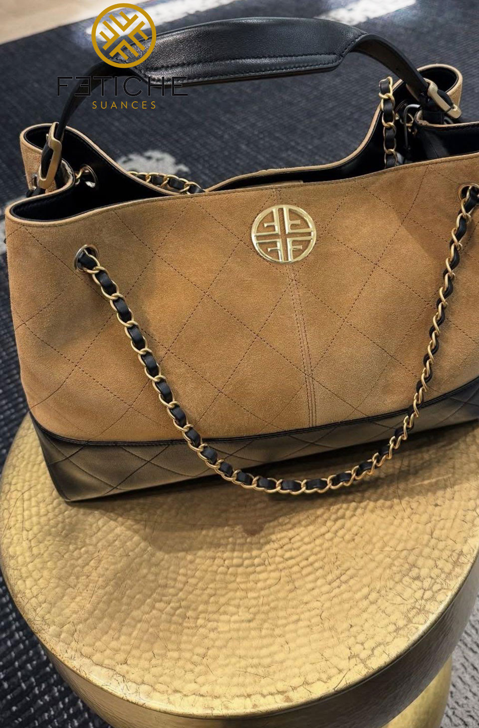 Este bolso de mujer combina elegancia contemporánea y funcionalidad diaria en un diseño exquisito. Elaborado en una mezcla de ante beige y piel negra, presenta un acabado suave de textura aterciopelada que contrasta con la firmeza del cuero trabajado a mano. El cuerpo del bolso muestra un acolchado con patrón de rombos, un guiño al estilo clásico de la marroquinería de lujo.