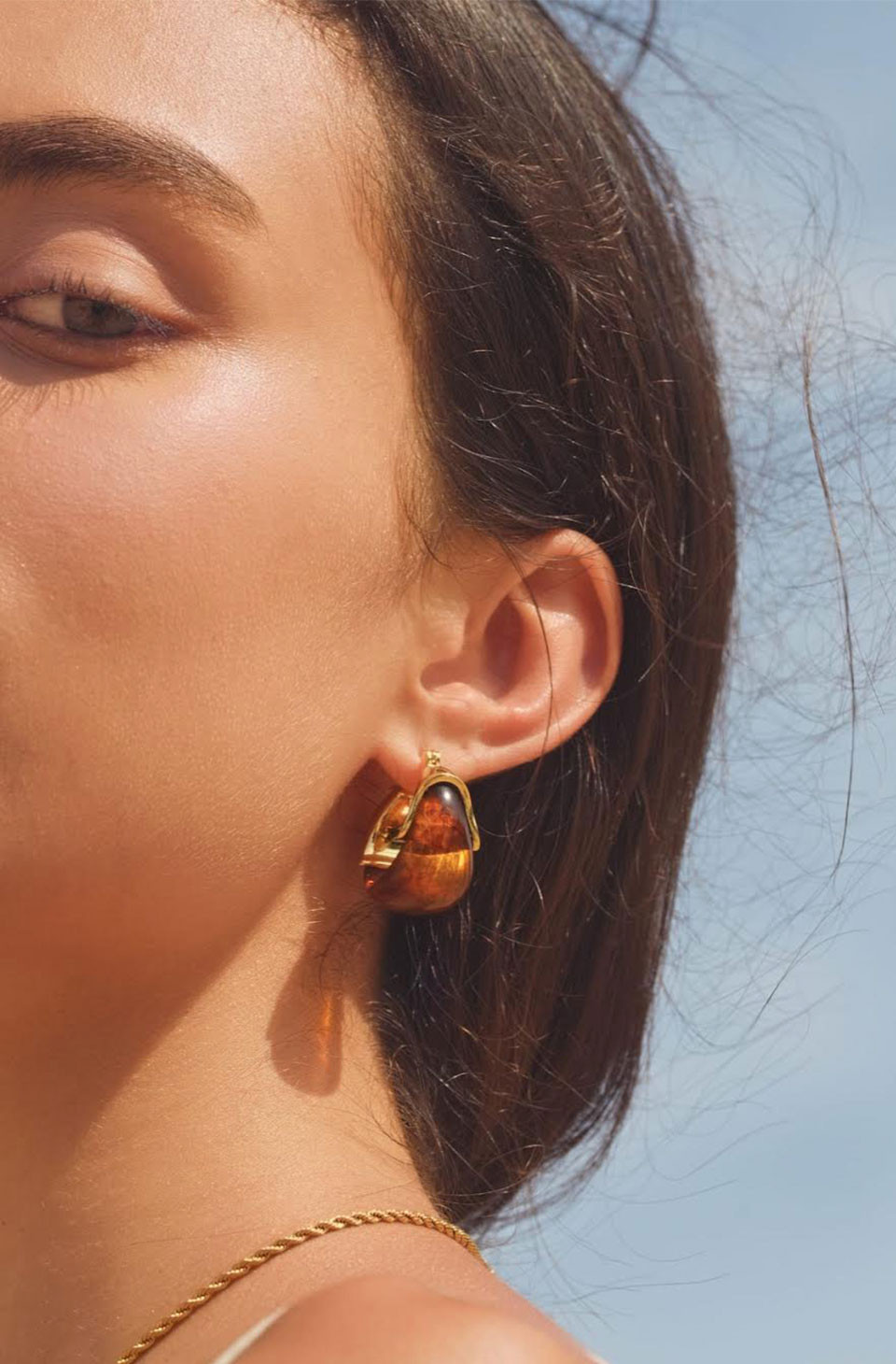 Estos pendientes combinan la calidez del ámbar con el brillo envolvente del oro, creando una pieza que equilibra fuerza y sutileza. Su forma orgánica recuerda a una escultura fluida, aportando carácter sin necesidad de estridencias.